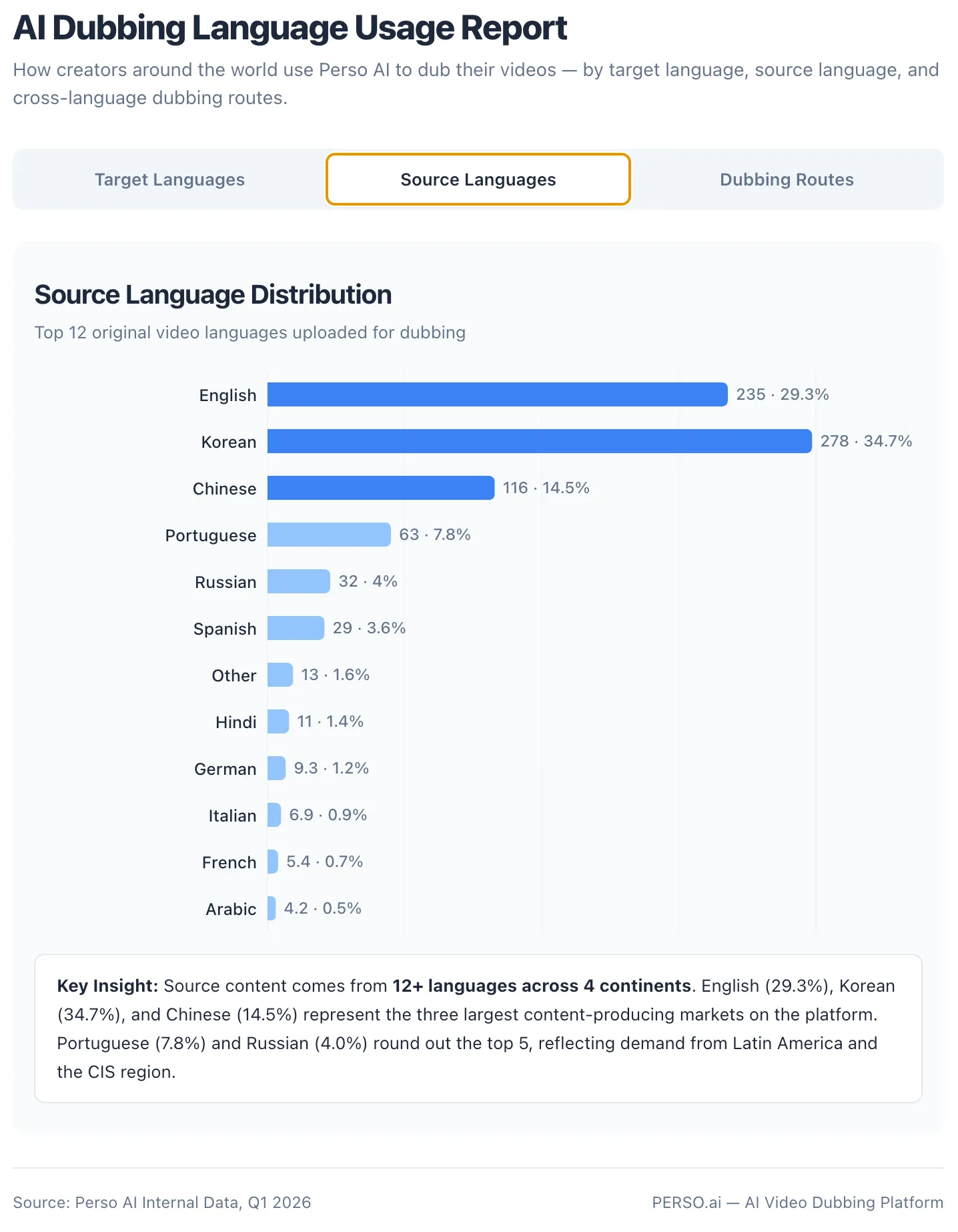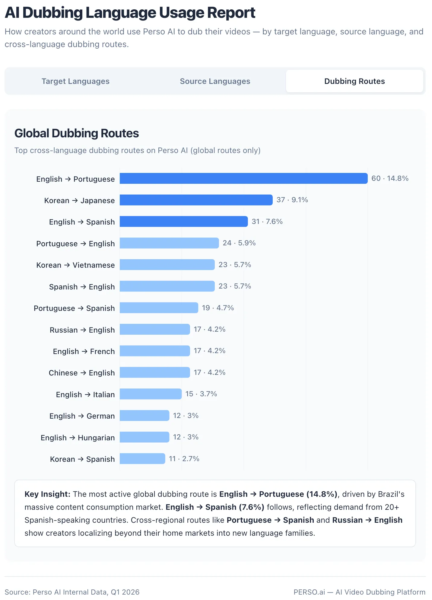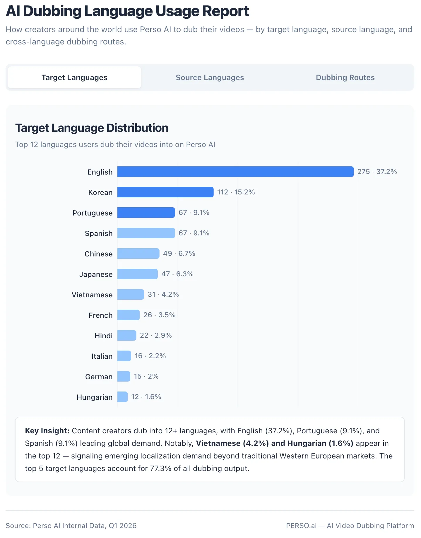 Perso AI 플랫폼 데이터(Q1 2026)에 따르면, 사용자가 비디오를 더빙하는 상위 5개 대상 언어는 영어(37.2%), 포르투갈어(9.1%), 스페인어(9.1%), 중국어(6.7%), 일본어(6.3%)이며, 이는 전체 더빙 출력의 68% 이상을 차지합니다. 가장 활발한 글로벌 더빙 경로는 영어 → 포르투갈어(14.8%)로, 브라질의 콘텐츠 소비 시장에 의해 주도되고 있으며, 그다음은 20개 이상의 스페인어권 국가 전반의 영어 → 스페인어(7.6%)입니다. 베트남어(4.2%)와 헝가리어(1.6%) 같은 신흥 시장도 상위 12개 대상 언어에 포함되어 있어, 전통적인 서유럽 시장을 넘어선 현지화 수요를 보여줍니다(Perso AI Internal Data, Q1 2026).
