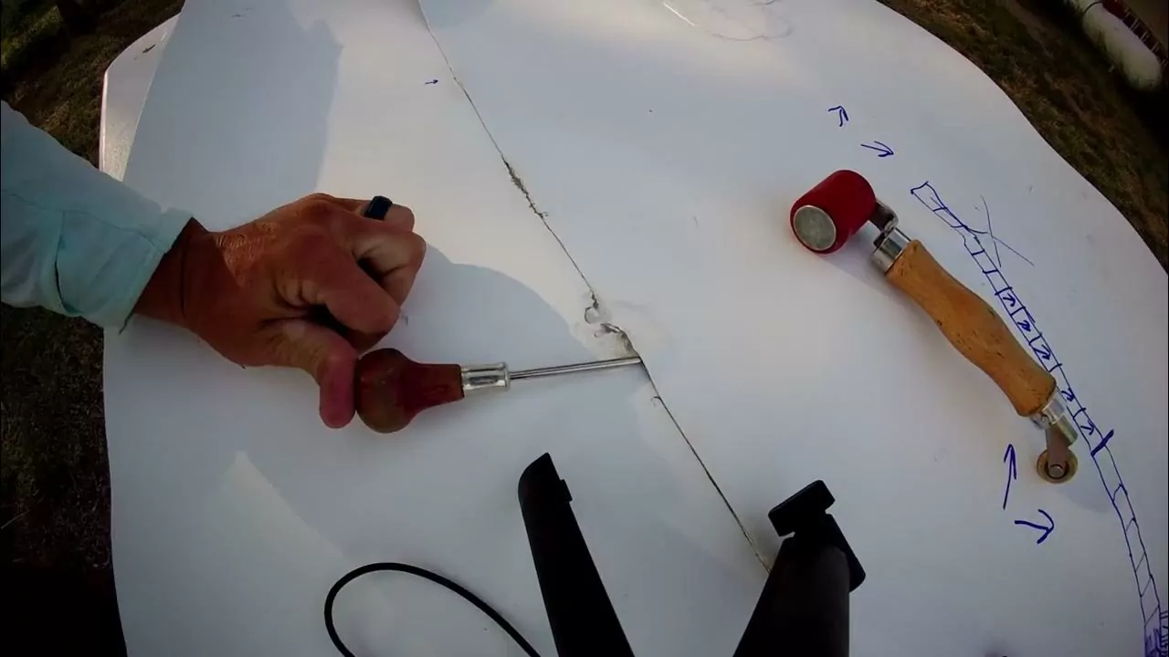 The speaker is demonstrating or instructing on a repair process, likely for a membrane or surface, providing technical guidance to an unseen audience.