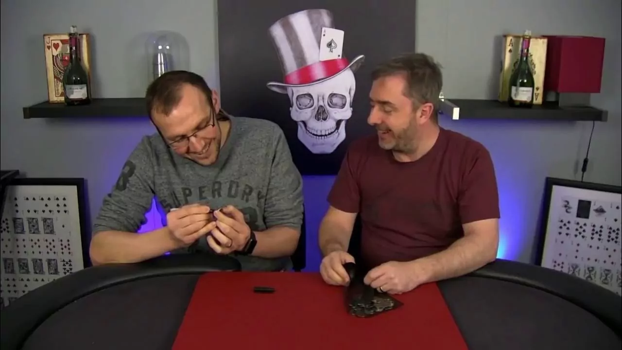 Speaker 01 (Wayne) is performing a magic trick, and Speaker 02 (Dave) is assisting or acting as a volunteer. They have a friendly and collaborative interaction.