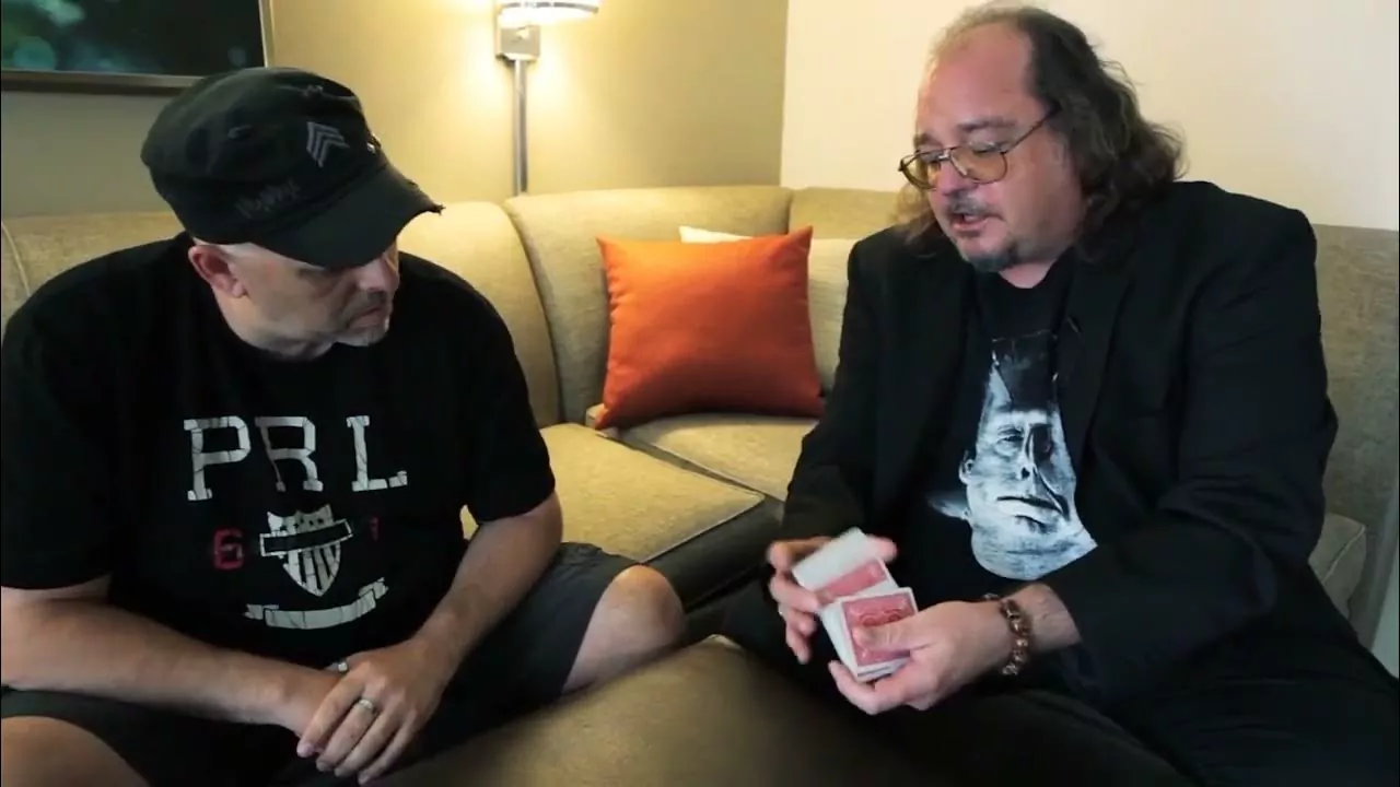 Bob Solari is demonstrating a card trick to John, who is acting as an assistant or audience member. They interact during the demonstration.