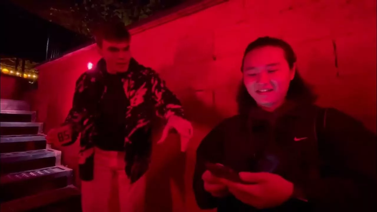 Speaker 01 and Speaker 02 are engaged in a playful challenge or game, with Speaker 01 directing actions and Speaker 02 participating. Speaker 03 makes a brief interjection, suggesting she is observing the interaction.
