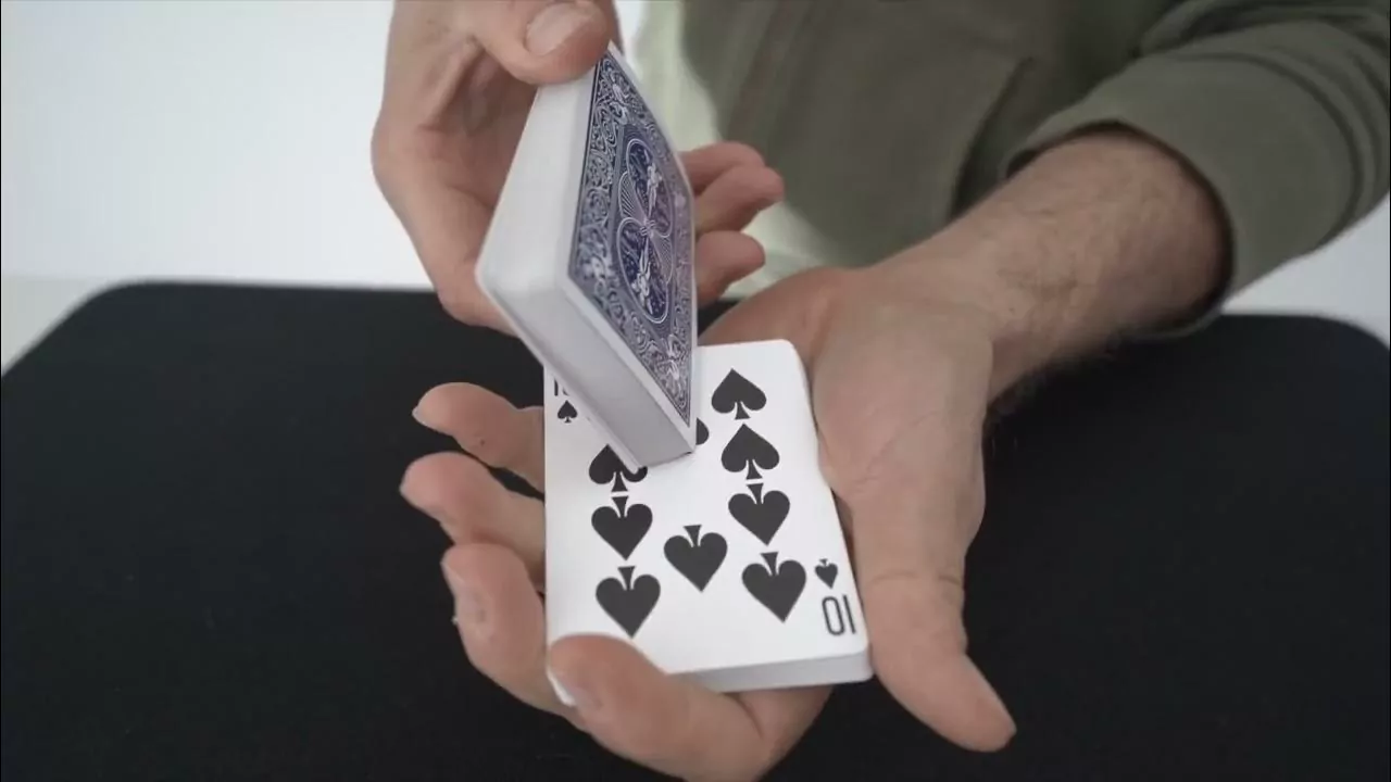 Ici, j'ai un jeu de cartes. Comme vous voyez, toutes les cartes sont différentes, 52 différentes. Je vais passer les cartes comme ça, et quand vous voulez, vous me dites stop. Vous pourriez m'arrêter sur la dame de cœur ou, par exemple, sur le 10 de pique. Dites simplement stop quand vous le souhaitez. Stop.