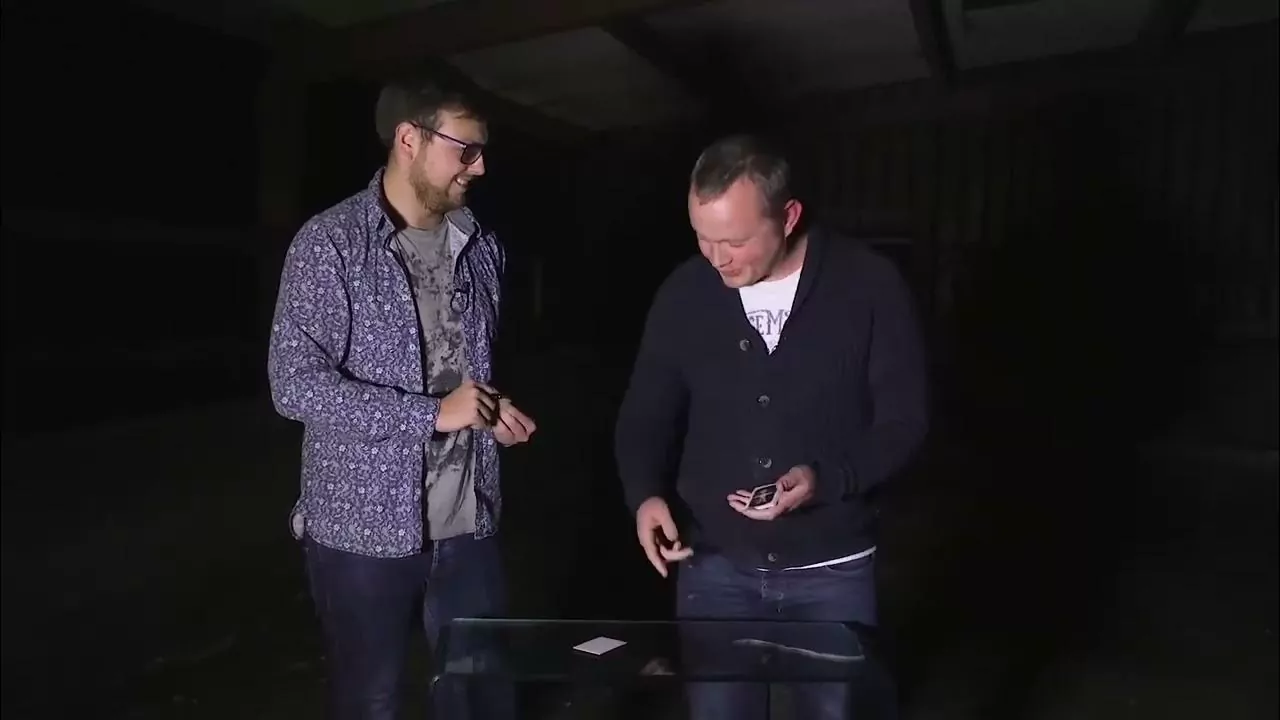 The magician (speaker_01) is demonstrating a voodoo-themed magic trick to another man (James), who acts as an assistant or participant. The magician guides James through the steps of the trick, explaining the process and creating a theatrical atmosphere.