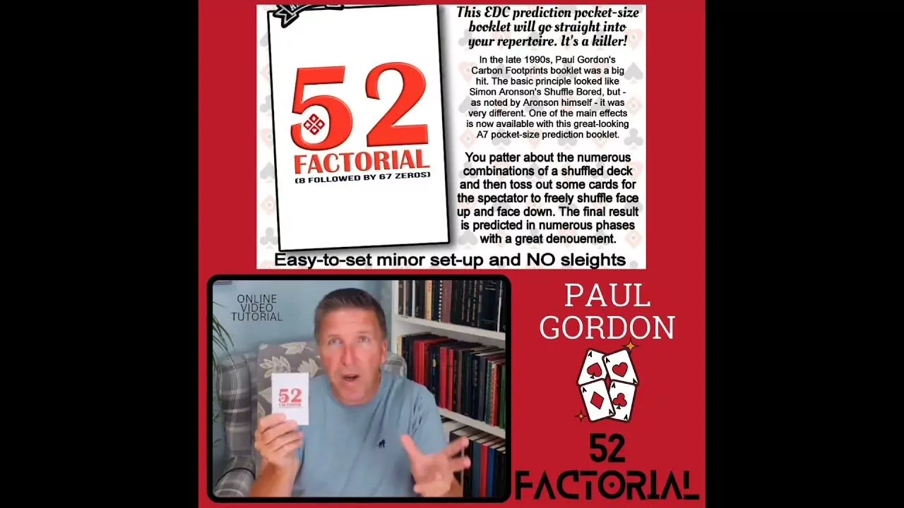 Salut à tous. Ici Paul Gordon, et voici 52 Factoriel. Qu'est-ce que 52 Factoriel ? C'est ça, 52 Factoriel. Vous prenez un jeu de cartes et vous en sortez deux paquets de cartes. Vous les mélangez face visible et face cachée. Le spectateur les mélange. Il mélange les cartes librement de toutes les manières. À la fin, vous montrez cette prédiction.