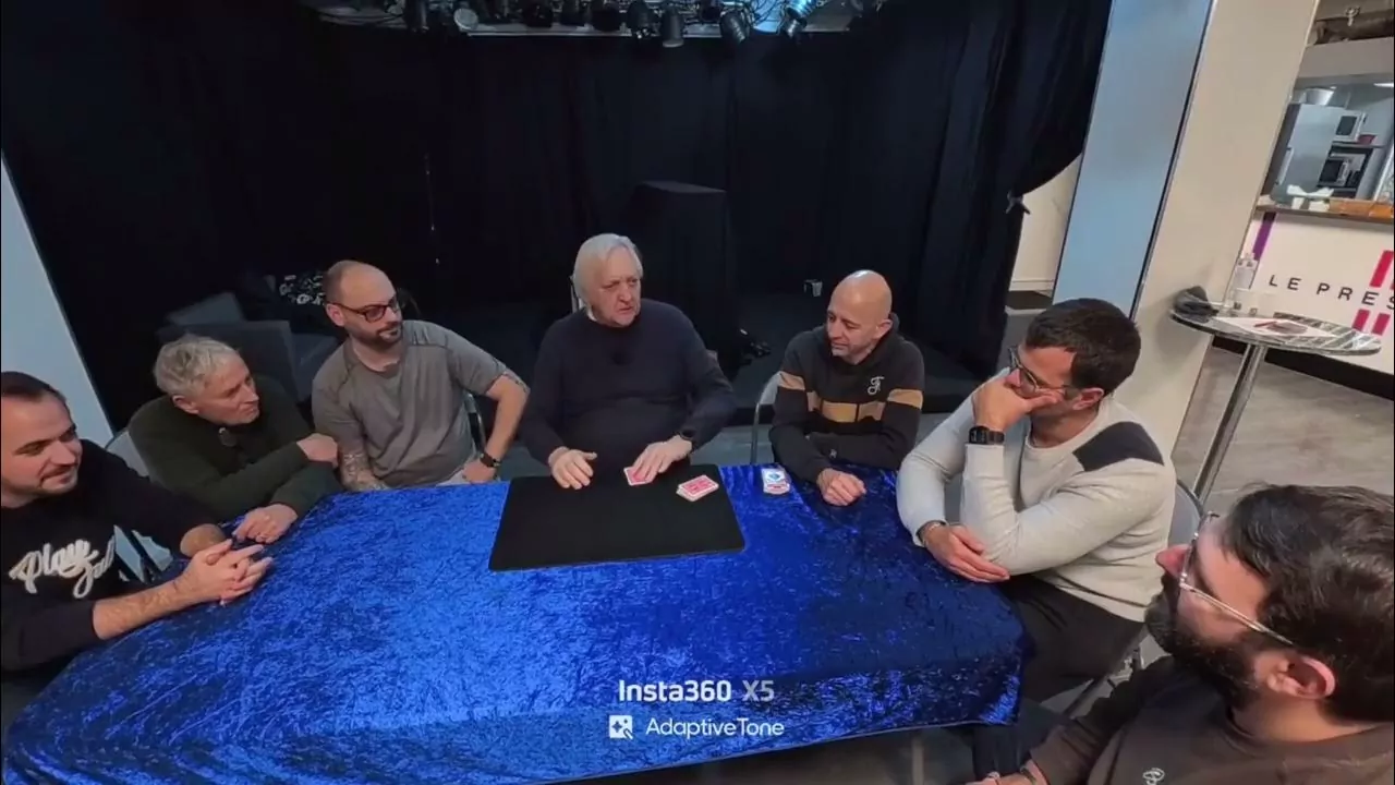 The main speaker (Magician) is performing a card trick for a group of men seated around a table. The other men are observing and occasionally interacting with the magician.