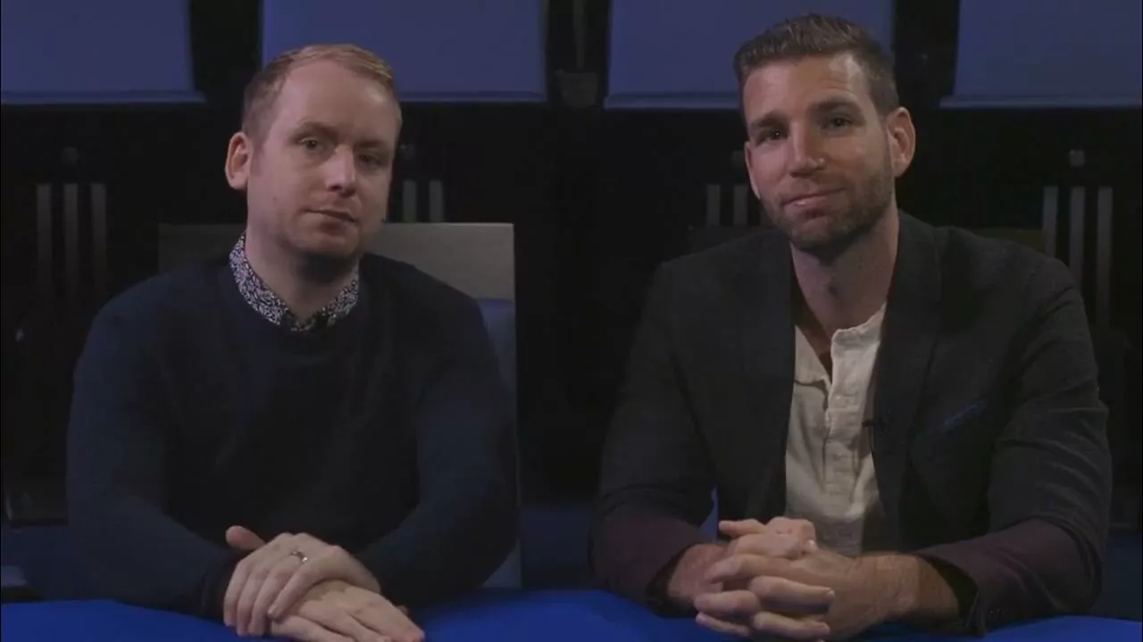 Two male hosts are presenting and discussing a product, specifically a Rubik's Cube designed for magic and speed cubing. They appear to be colleagues or co-presenters, collaboratively highlighting the product's features.