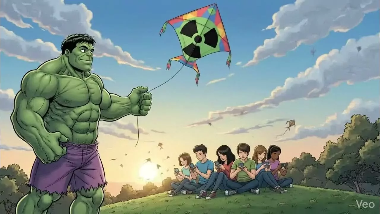 Hulk is interacting with a group of children who are engrossed in their mobile phones. He is trying to encourage them to participate in an outdoor activity (flying a kite) instead of using their devices.