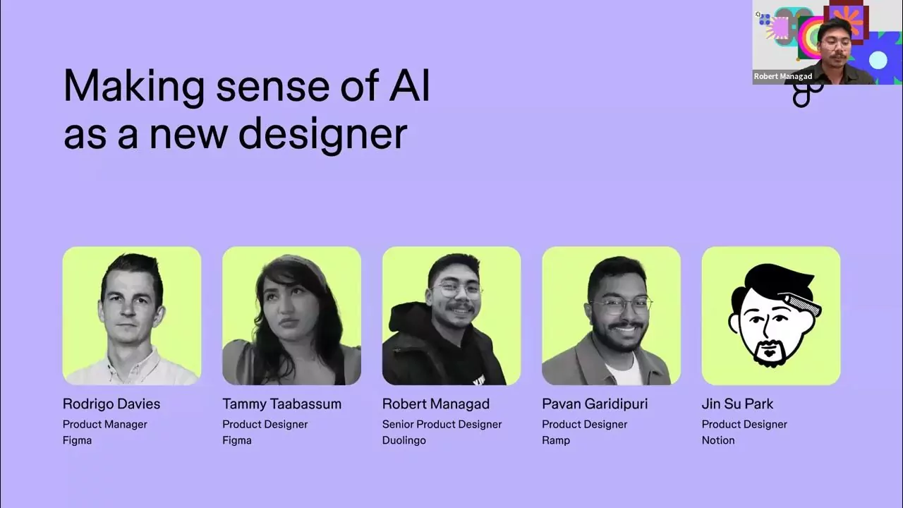 Joanna, a Figma Higher Education Marketing lead, hosts a panel discussion moderated by Rodrigo from Figma’s AI Experiences team. The panelists include Tammy, a product designer at Figma, and product designers Robert (Duolingo), Pavan (Ramp), and Jin (Notion). They discuss the role of AI in design and their professional experiences.