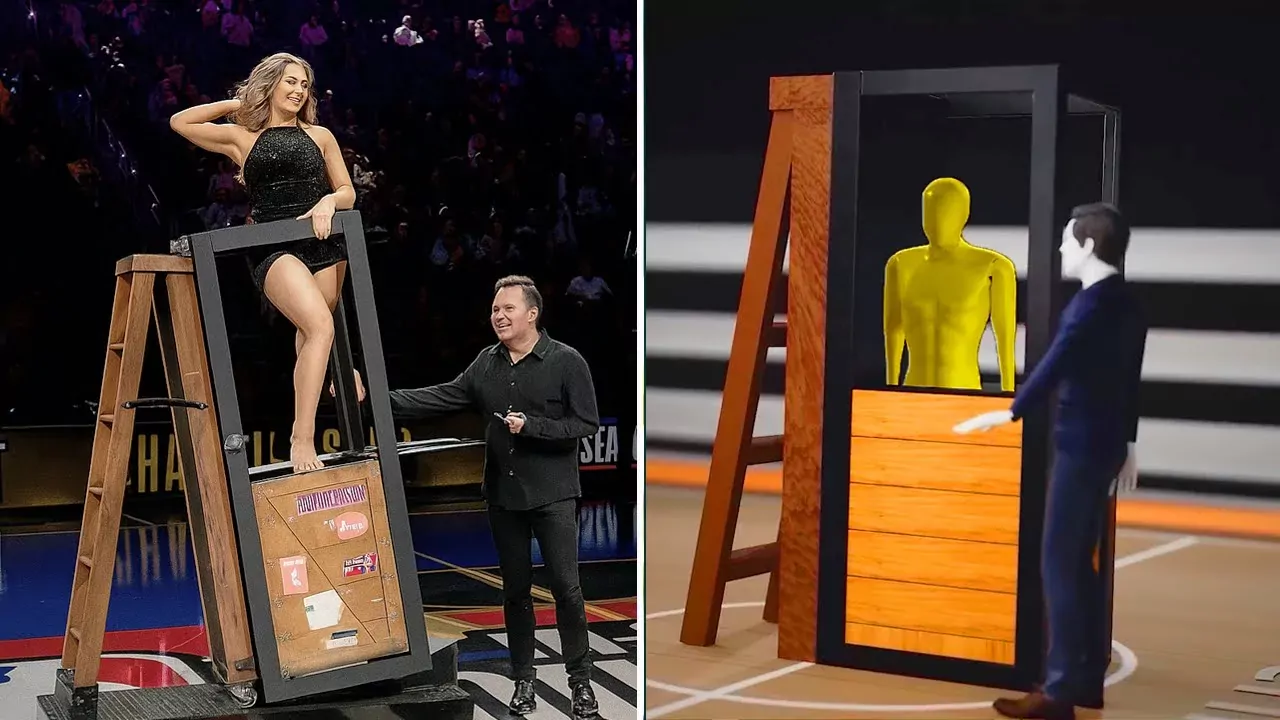In this video, I will reveal Nathan Burton's vanishing woman illusion. Here's a quick recap of what happened. The magician has his assistant climb into a box, inside which she hides. After closing the lid, he disassembles the box part by part, and as soon as the last half lands, the woman suddenly appears from inside that very box. So what's the secret behind this illusion? There's no possible way for the assistant to hide inside those segments. While the breaking up of the box into different segments was only misdirection, the assistant cleverly hides within the thickness of the ladder and where the box contacts it. But how does she get inside this space?