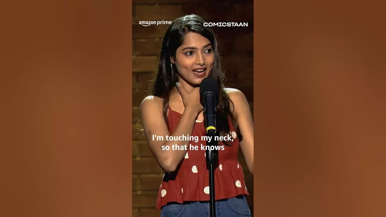 Shreya is narrating a humorous story about an interaction she had with a person named Kaabir to an audience at a stand-up comedy show. She is the sole speaker on stage, addressing the audience directly.