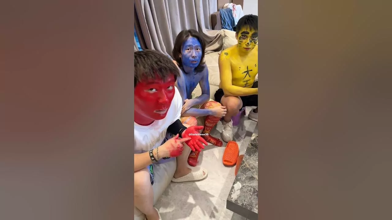 Todos estos chicos se pintaron la cara. Incluso algunos amigos usaron colores negro y amarillo para parecer fantasmas. Al principio, todos se reían mucho, pero al poco tiempo se asustaron porque la pintura no salía. Directamente se culpó a este chico, porque la idea fue suya. Cuando intentó lavar con agua, la pintura se pegó aún más, para quitar la pintura, todos se fueron a sus habitaciones. Lo extraño fue que los otros chicos se limpiaron completamente, pero ese pobre chico todavía parecía un payaso. Cuando le preguntaron qué color había usado, él respondió...