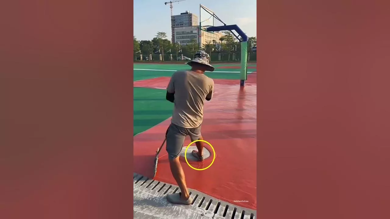 Miren, justo cuando el trabajo de pintura en la cancha estaba a punto de terminar, un error de este hombre lo arruinó por completo. Mientras pintaba, solo quedaba una parte pequeña, pero no se dio cuenta de que sus zapatos se habían manchado con pintura. Sin fijarse, puso el pie directamente en el suelo, manchando así el resto de la cancha, todo a causa de un pequeño descuido de su parte.