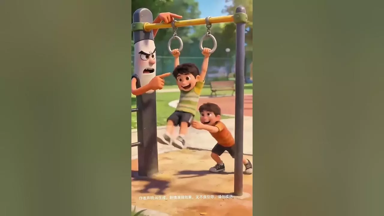 Hey, stop it! Don't just swing around like that; this hanging bar is specifically for seniors. You naughty children, get down this instant! Stop pushing each other around! It's very dangerous; the metal bars could easily break and you could all fall down. My grandchild, are you okay? You useless hanging around, you should be removed. But none of this is actually my fault!