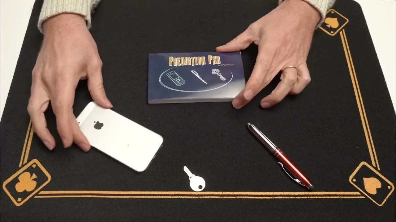 Salut Stefano. Salut. J'ai ici un petit carnet, et sur ce petit carnet, il y a une prédiction. Ok. On y reviendra. J'ai aussi trois objets : un téléphone, une clé, un stylo.