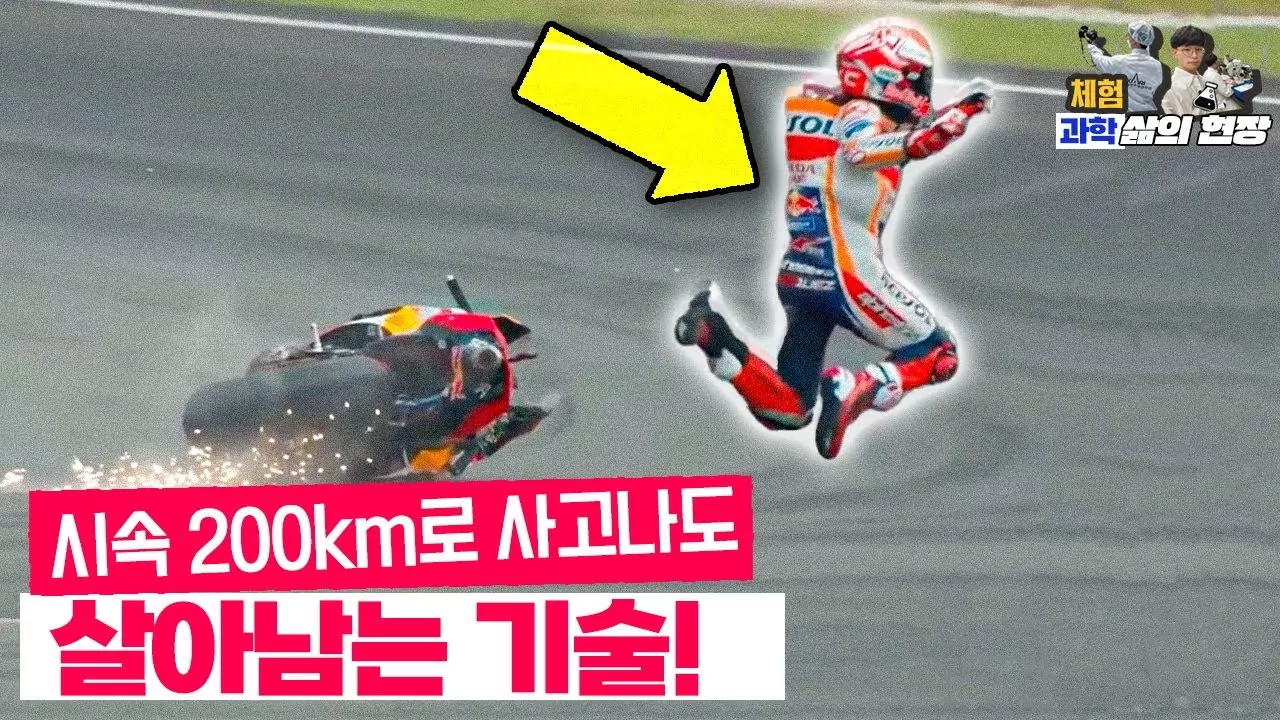 많이 빠졌습니다. 몸무게. 오토바이 경주 경기를 보면 쫄쫄이 같은 슈트를 입고 있는데 알고 보면 덩치있는 에어백이 장착된 것을 볼 수 있습니다. 전신 에어백이죠. 자, 오토바이 사고 장면을 한번 볼까요? 경기 중에 오토바이에서 선수가 튕겨져 나갈 때 일호 초 만에 에어백이 펼쳐져서 몸을 보호합니다. 튕겨져 나갈 때 중력 가속도는 삼십G 이상이라고 하네요. 그래서 오토바이 경주 사고가 나서 날아가는 선수들을 보면 죽거나 중상을 입어서 경주를 못할 것 같아 보이는데 다시 일어납니다.