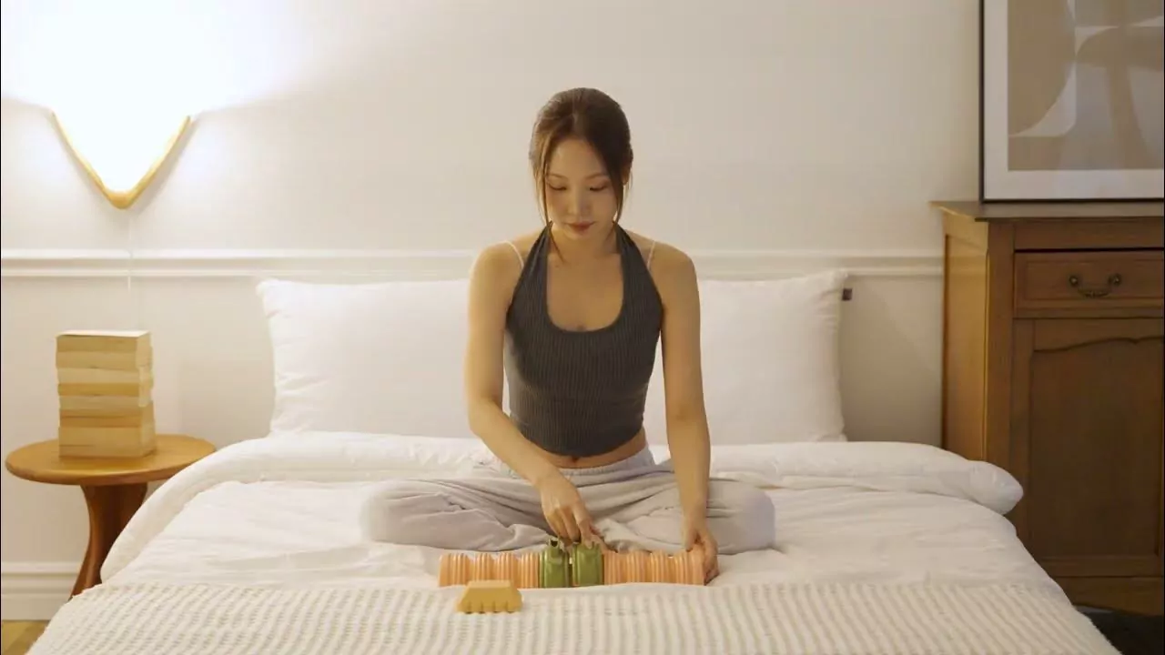 뷰링이들 오늘은 복부와 엉덩이 긴장하면 쉽게 경직되는 두 부위를 부드럽게 풀면서 몸과 마음을 같이 릴랙스 해주는 시간을 가져볼게요. 필요한 준비물은 비스킷 토핑, 마차링, 베이직바, 베개입니다. 그리고 뭉친 근육이 릴랙스 될 수 있도록 침대 위에서 준비해주세요. 자, 먼저 마차링을 베이직바 사번, 오번에 연결하고. 그 다음 비스킷 토핑을 위에 결합시켜 주세요.
