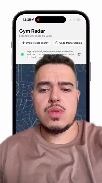 Dica pra você treinar melhor: abra o Gym Radar, clica nessa opção aqui, escolhe o horário aí que cê tá querendo treinar , espera um pouquinho e ele vai mostrar pra você a melhor academia vazia pra você treinar nesse horário. Nesse caso, foi essa vinte e quatro horas aqui. Baixa o Gym Radar!