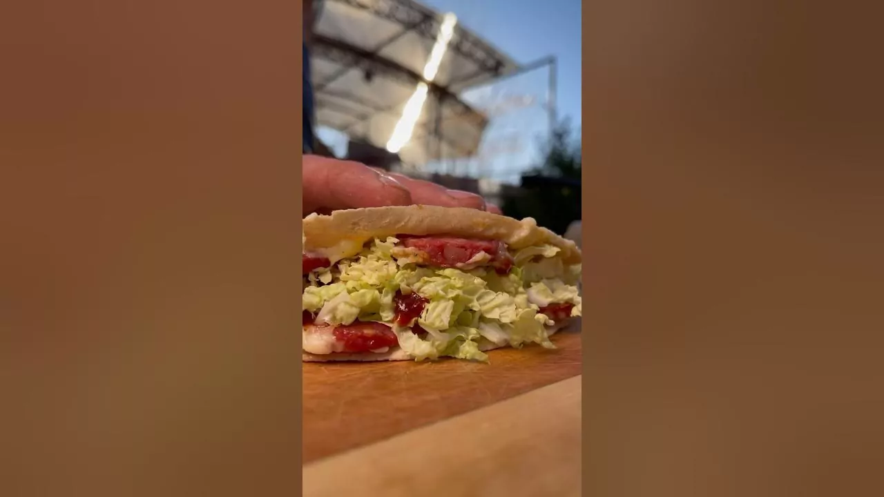 Pizza in five minutes. Slice some fresh sausage into rings, put them in a frying pan, and then move on to the lightly salted cucumbers. We've been waiting all winter for this recipe. A spicy pepper is a must, followed by a blanket of melted cheese. Finish it off with a tortilla and flip it while it fries. Of course, some cabbage for freshness. We'll season it with salt and get ready to stuff it. For the sauce, I'm using ketchup. We roll up the lavash and serve it, creating an amazing pizza-sandwich. Definitely a like! You absolutely have to try this one!