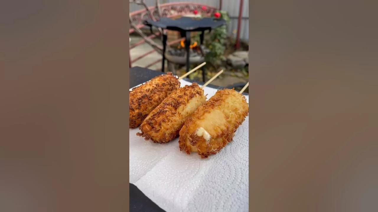 Корейский хот-дог из дошика. Ммм! Зальем стакан воды, ложка дрожжей и соли. Перемешиваем, постепенно добавляем муку. Оставим тесто на полчаса. А тем временем нарежем сыр. Разомнем дошик или любую другую лапшу. А пока займемся костром. Добавим масла, нанизаем сыр и переходим к тесту. Обволакиваем сыр в тесте, а затем в дошик, а пропуски засыплем сухарями.