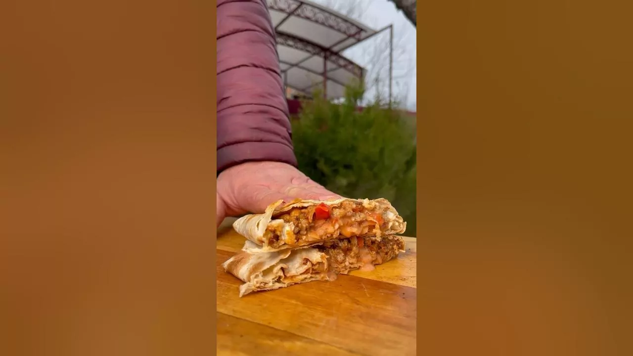 Don't know what to do with minced meat? I'll show you. First, oil the cauldron, then add the homemade minced meat. Salt and pepper are to taste. Definitely add onion half-rings, bell pepper strips, and tomato slices, then we'll move on to the sauce. Ketchup, mayo, and mustard. And how about some cheese? On a double-layered Armenian lavash, we'll add tomatoes, sauerkraut, and the sauce. All that's left is to seal the little wrap and toast it nicely.